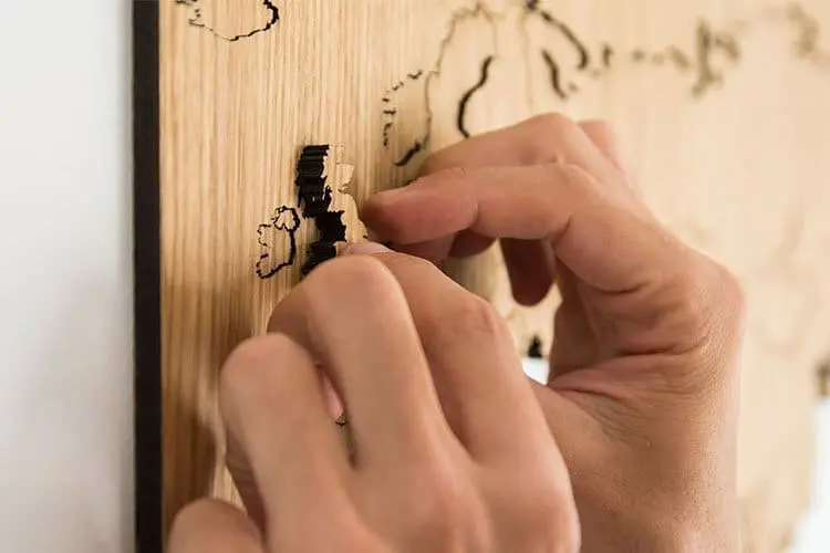 Als je de houten wereldkaart van de muur wilt halen, houd er dan rekening mee dat er schade kan ontstaan aan het onderliggende oppervlak. De beste manier om dit te doen, is door het oppervlak lichtjes op te warmen met een föhn en vervolgens de stukjes voorzichtig te verwijderen. Voor onderdelen die niet los willen komen, kun je een plamuurmes gebruiken en ze voorzichtig omhoog wippen. We raden aan om de passtukken te bewaren, zodat je de wandkaart ergens anders opnieuw kunt aanbrengen. We kunnen echter niet garanderen dat de wandkaart wereld net zo goed blijft plakken als de eerste keer.