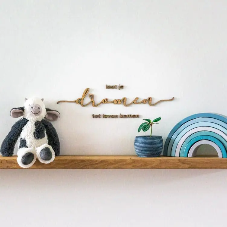 Concevez votre propre texte ou nom en bois unique pour le mur. Avec notre outil de conception, vous pouvez facilement choisir différentes polices et vous pouvez également ajuster la taille du texte en bois. Vous pouvez rapidement rendre une chambre d’enfant unique avec des lettres en bois sur le mur ou sur le parc. Choisissez une belle énonciation ou le nom de votre enfant ou un autre mot amusant. Voulez-vous un beau swash manuscrit ou préférez-vous une police élégante?