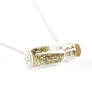 Le message est livré dans une bouteille en verre avec du liège et est suspendu à une chaîne à billes en métal.