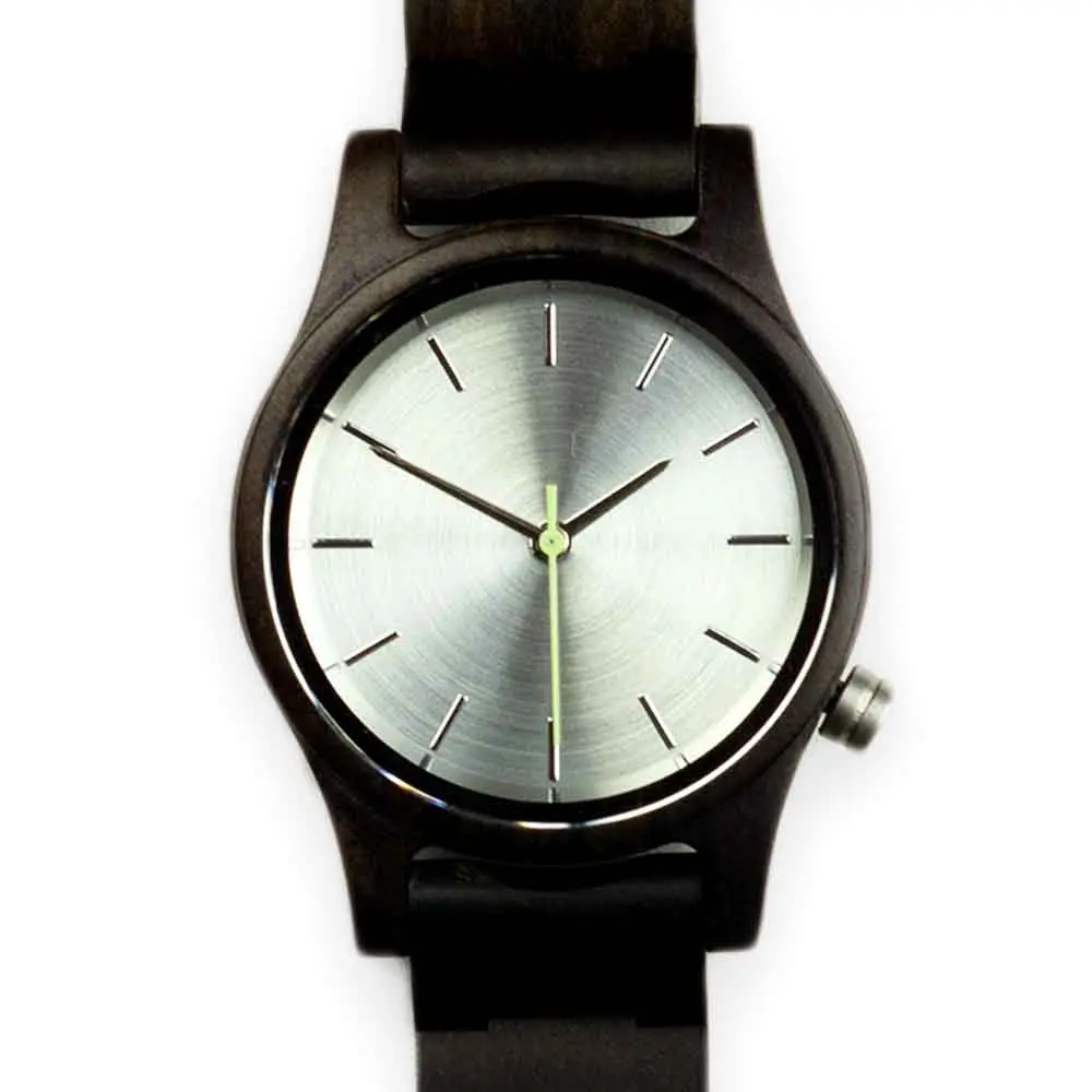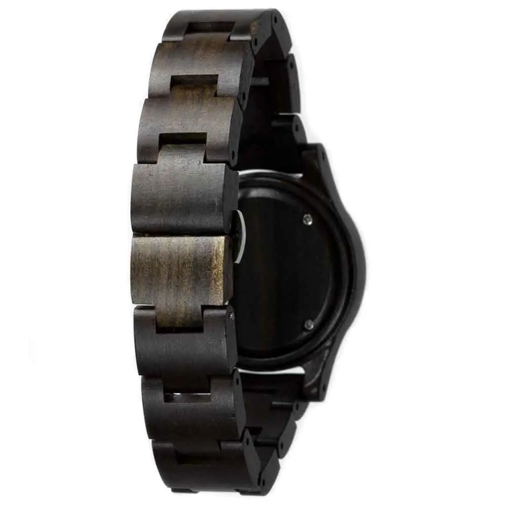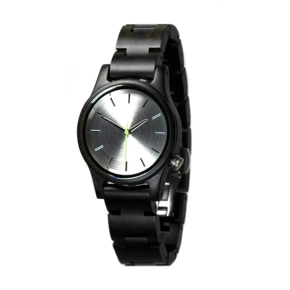 La montre en bois Sahara est un modèle classique et luxueux, d’un diamètre de 35 mm, en bois de santal noir. Une belle montre en bois pour femme, en raison de sa taille subtile. Le bois foncé, combiné au cadran argenté minimaliste, lui donne un aspect luxueux et convient aussi bien aux hommes qu’aux femmes.
