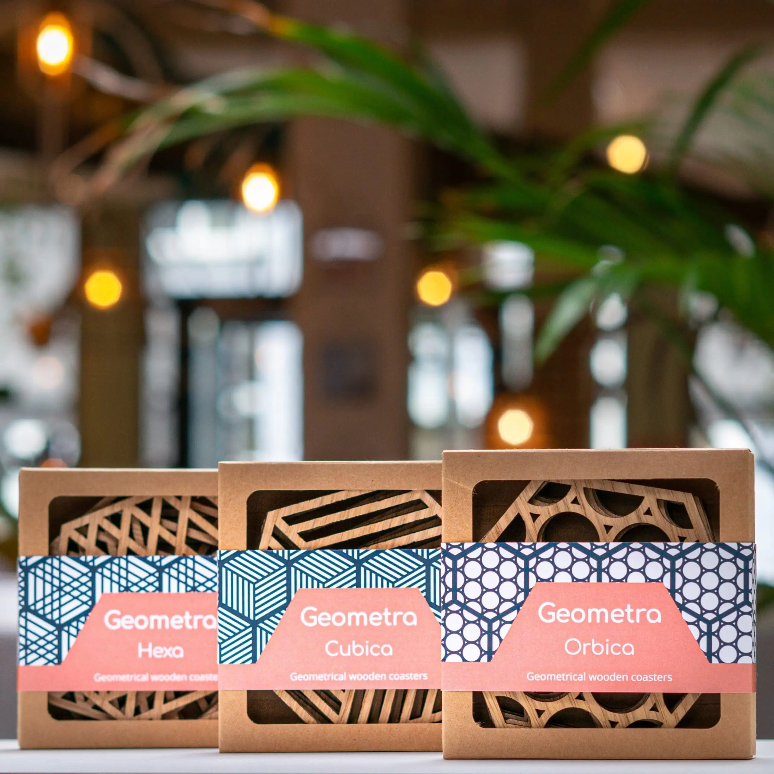 Sous-verres géométriques en bois Cubica – fabriqués en chêne de 4 mm avec une finition teintée, ils sont donc protégés contre la saleté et l’humidité. Les côtés noirs du bois offrent une belle texture et une profondeur supplémentaire, ce qui donne une belle ombre portée sur votre table.